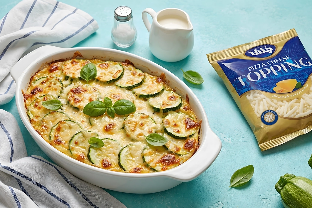 Spread a layer of béchamel sauce in an oven-safe dish, then arrange the zucchini on top.
